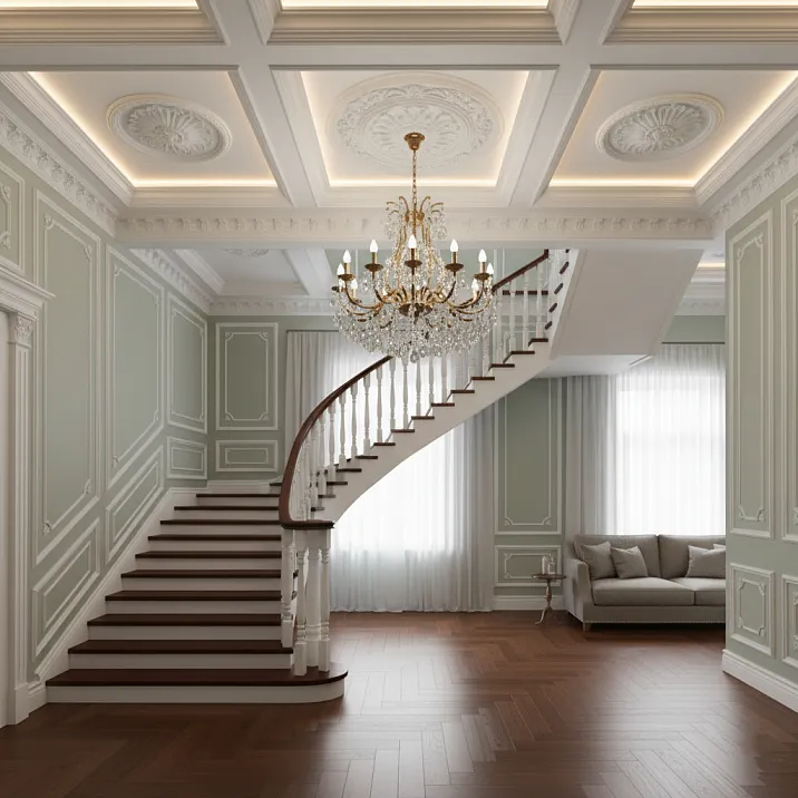 Классическая каменная или мраморная лестница (в особняках, дворцах) требует роскошной гипсовой или полиуретановой розетки с глубоким рельефом, имитирующей гипсовую лепнину. Фасадный декор из полиуретана той же серии может повторяться на внешних порталах, создавая единство интерьера и экстерьера.