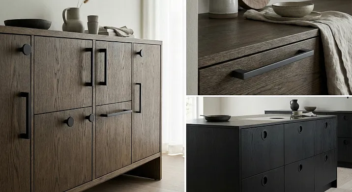 Сочетание черного металла и светлого дерева — основа скандинавской эстетики. Простые цилиндрические или П-образные скобы, деревянные ручки с черными торцами. Функциональность, природность, сдержанная элегантность.