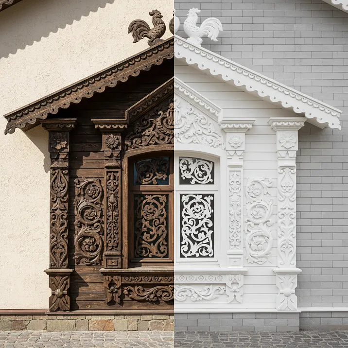 Главное преимущество литьевой технологии - возможность создания форм любой сложности. Глубокие подрезы, нависающие элементы, тончайшие детали, которые в ручной резьбе по дереву требовали бы сотен часов виртуозной работы, в полиуретане воспроизводятся идеально и многократно. Можно создать точную копию исторического деревянного наличника 19 века, античной капители, барочной розетки - любого декоративного элемента, независимо от сложности.