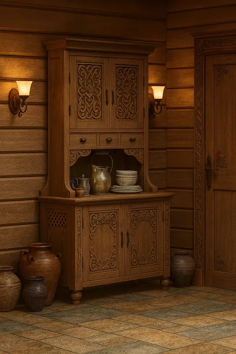 Шкафы в русском стиле — это не просто мебель, а архитектурные сооружения в миниатюре. Их фасады часто украшают резьба, роспись или филенки, напоминающие о традиционных русских наличниках.