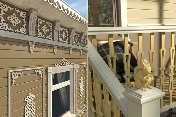 Мотивы резьбы черпаются из народной традиции — растительные орнаменты, геометрические узоры, стилизованные изображения животных и птиц. Каждый элемент несет символическое значение и служит оберегом дома.