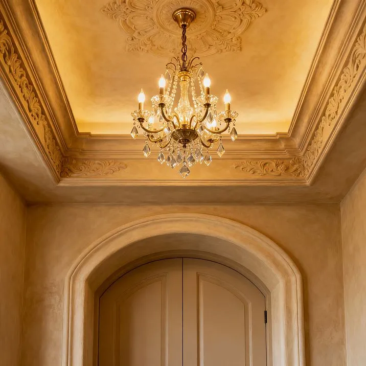 Декоративные элементы интерьера раскрывают свою красоту только при правильном освещении. Лепнина под люстру потолочную создает сложную игру света и тени на потолке - рельефные орнаменты отбрасывают мягкие тени, которые усиливают восприятие объема и глубины. Направленный свет от люстры скользит по поверхности резных элементов, выявляя тончайшие детали декора, которые при равномерном освещении оставались бы незамеченными.
