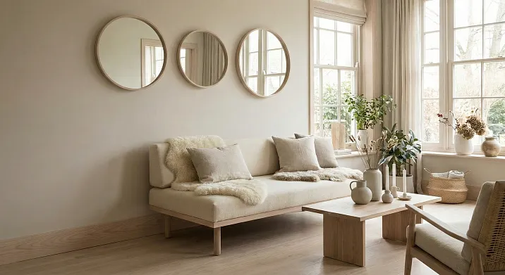 Одно-два круглых зеркала в простых деревянных или белых рамах размещаются напротив окон или на пустых стенах. Зеркала должны отражать свет и красоту, не хаос.