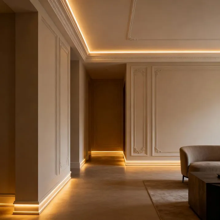 Hi Wood выпускает специальные профили для нестандартных ситуаций. Гибкие карнизы с пазом для LED позволяют создавать подсветку криволинейных элементов - арок, колонн, эркеров. Угловые элементы с интегрированными нишами обеспечивают непрерывность световой линии в местах поворотов.