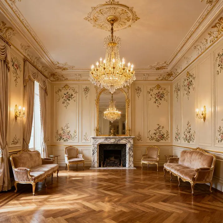 Люстра в центре гостиной или столовой с буазери требует обрамления - потолочной розетки. Полиуретановая розетка диаметром 60-100 сантиметров с орнаментом, согласованным со стилем буазери, создает завершенность композиции. Для классических буазери - пышные розетки с растительным декором. Для неоклассических - сдержанные с геометрическим паттерном.