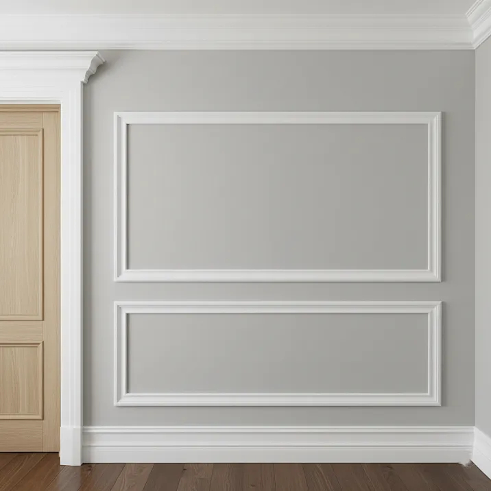 Панельные молдинги на высоте 90-100 сантиметров создают цокольную зону, традиционно окрашиваемую темнее основной стены или оклеиваемую контрастными обоями. Ширина панельного молдинга 5-7 сантиметров, профиль простой - валик с полочками. Панели внутри рамок формируются вертикальными молдингами той же ширины, создающими прямоугольные секции.