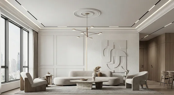 Минимализм не любит декор ради декора. Каждый элемент должен иметь функцию — структурную, зонирующую, пространственно-организующую. Лепнина в минималистичном интерьере работает как архитектурный каркас, выявляющий геометрию помещения.