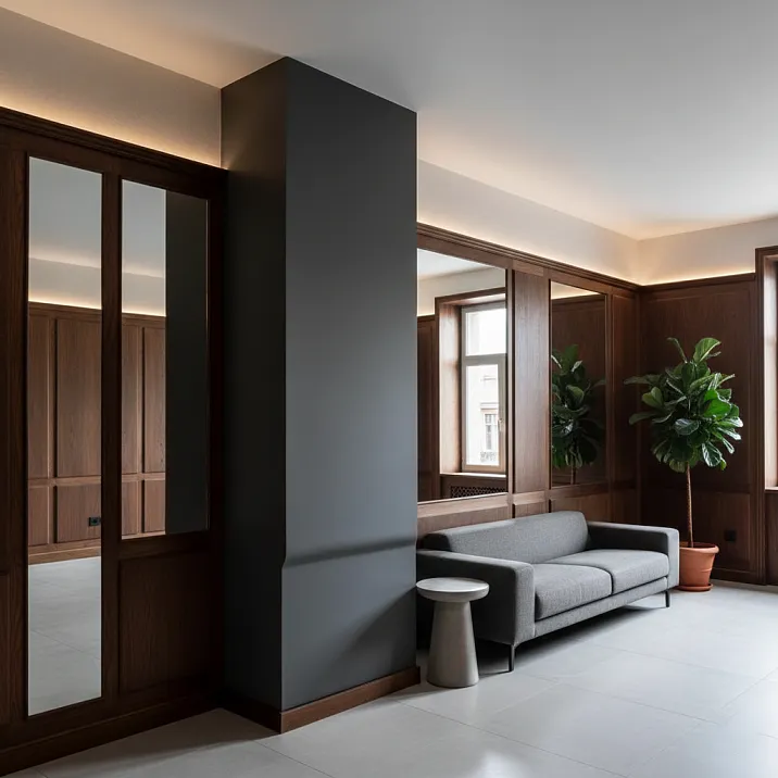 Коридор — это узкое помещение, которое страдает от недостатка света и визуальной тесноты. Буазери с зеркальными филёнками решает обе проблемы. Деревянные панели защищают стены от загрязнений и механических повреждений (обувь, сумки, зонты), а зеркала расширяют пространство и усиливают свет.