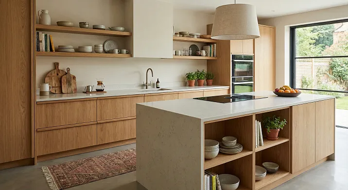 Столешница острова — место для эксперимента. Если основная столешница из искусственного камня белого цвета, столешница острова может быть из дерева, создавая тёплый акцент и дополнительную рабочую поверхность для нарезки. Или из мрамора с выраженными прожилками, делая остров роскошным центральным элементом.