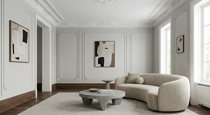 Неоклассический интерьер требует сдержанности и пропорциональности. Карнизы и молдинги выбираются с лаконичными профилями без избыточного орнамента. Классические мотивы присутствуют, но интерпретируются деликатно — простые ионики, сдержанные меандры, геометрические порезки. Деревянные плинтусы с классическим профилем дополняют композицию.