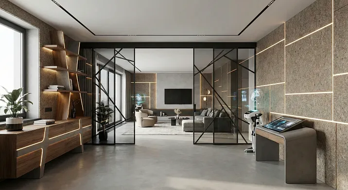 В минималистичных интерьерах средники используются как структурные элементы, создающие геометрическую чёткость. Плоские широкие планки, окрашенные в тон стен или контрастно, делят пространство на зоны. Деревянные рейки в интерьере создают ритмичную структуру, близкую функции средников.