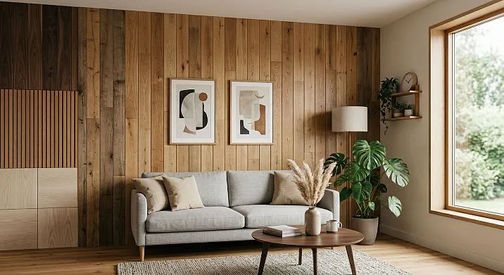 Гостиная — главное пространство для деревянной отделки. Стена за диваном, ТВ-зона, плоскость при входе в комнату — все три варианта работают. Реечные деревянные панели создают современный ритм и глубину; гладкие шпонированные — благородный, спокойный фон. Обшитая деревянными панелями стена в гостиной объединяет мебель, свет и декор в единую композицию — именно это делает пространство цельным.