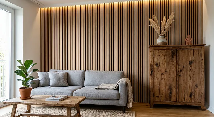 На расстоянии от дивана (3–4 метра) — убедительный образ деревянной реечной стены. Тёплый золотистый тон, ритм вертикальных планок, тени в зазорах. Инженерная доска на полу близкого тона «перекликается» с реечной стеной — создаётся ощущение природного единства.