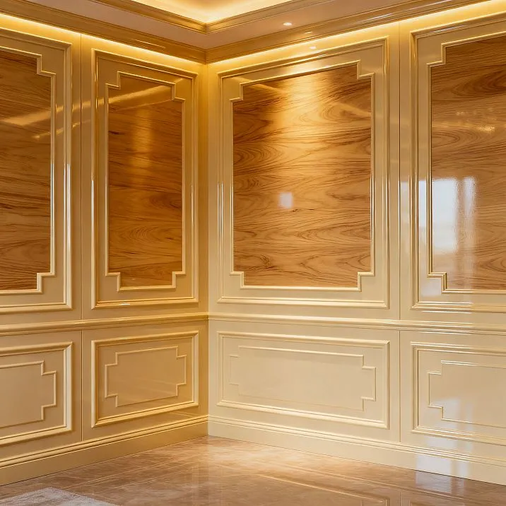 Золочение - накладки покрываются золотой краской или поталью (имитация сусального золота). Дорогое решение, создающее роскошь, торжественность. Золоченые накладки на темных дубовых панелях - барочная пышность. На светлых буковых - неоклассическая элегантность. Для парадных залов, где важна представительность.