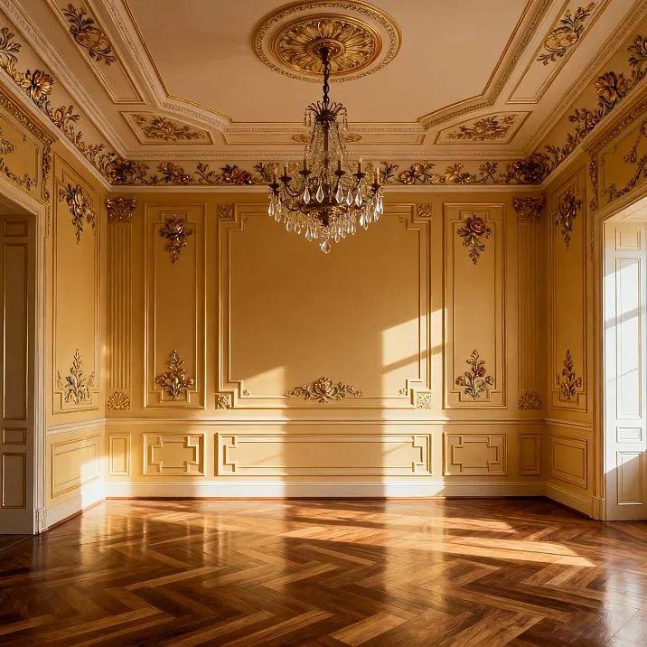 Альтернативный подход - золочение. Декоративные элементы покрываются золотой краской или поталью, создавая эффект драгоценности. Это характерно для стиля ампир - поздней версии классицизма с имперской помпезностью. Hi Wood выпускает специальные профили со сложным рельефом, предназначенные именно для золочения.