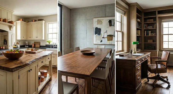 Дерево универсально, но его применение различается в зависимости от стиля. Рассмотрим, как деревянные столешницы вписываются в разные эстетики.