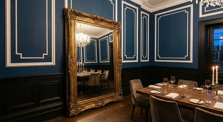 Можно ли создать такую атмосферу дома? Можно. Не копируя ресторанный дизайн один в один, но позаимствовав принципы, приёмы, детали. Тёмный плинтус формирует визуальный каркас вокруг светлых стен, создаёт контраст, графичность, чёткость границ. Большое зеркало напротив или сбоку от стола визуально удваивает пространство, отражает свет люстры, создаёт иллюзию глубины. Крупные рамки-молдинги вокруг зеркала и на стенах структурируют плоскости, создают ритм, архитектурную организацию.
