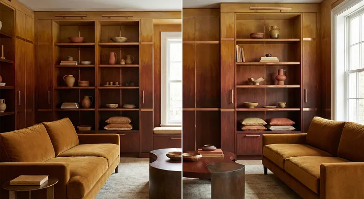 Цветовые переходы могут быть в рамках одного цвета (от светлого махагони к тёмному) или между разными цветами (от охры к терракоте, от натурального дерева к махагони). Каждый вариант создаёт свой эффект, своё настроение.