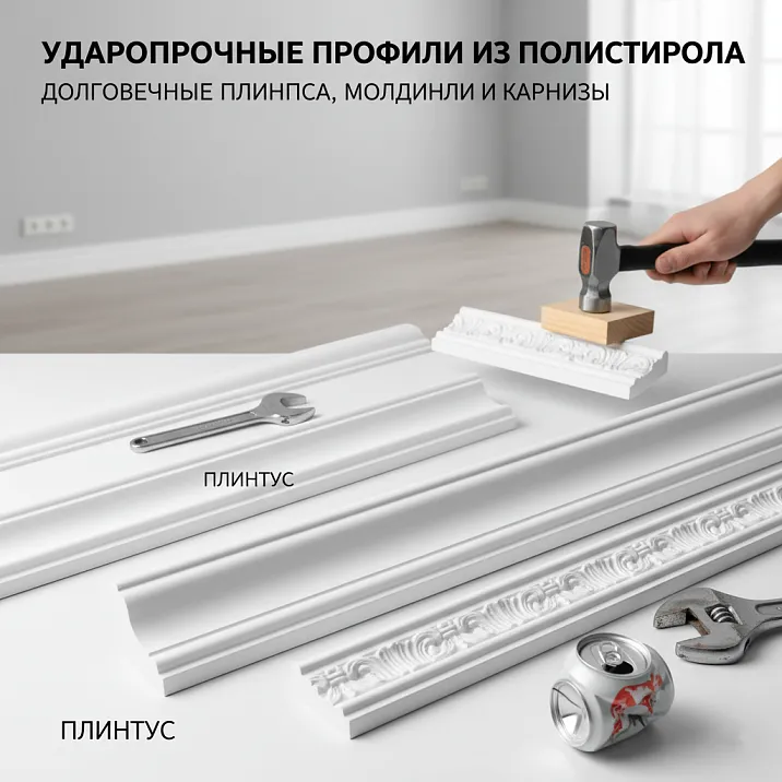 Ударопрочные профили из полистирола - это синтез технологичности, эстетики и экономической целесообразности. Плинтус напольный ударопрочный полистирол, плинтус потолочный полистирол ударопрочный и молдинг полистирол ударопрочный от ведущих производителей обеспечивают долговечную защиту и безупречный внешний вид помещений любого назначения.