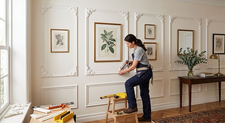 Стена за диваном — классическое место для рамок из молдингов. Одна крупная рамка по ширине дивана, или три рамки меньшего размера с равными отступами — в обоих случаях угловые элементы создают точки притяжения, которые визуально «держат» всю зону.