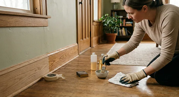 Восковый карандаш — для ленивых и срочных случаев. Если скол небольшой (до 3 мм), поверхность под лаком — восковый карандаш (цветной, в тон плинтуса) решает проблему за 2 минуты. Заполнить скол воском, разровнять пластиковой картой или ногтем, излишки убрать. Глянцевая поверхность — отполировать. Долговечность такого ремонта — 2–3 года.