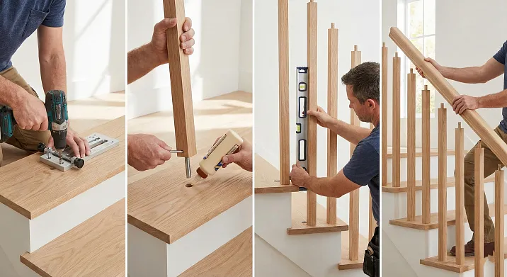 Если лестница — единственный путь на второй этаж, работайте поэтапно: установите балясины на половине ступеней, дайте клею высохнуть, пользуйтесь этой частью. Затем вторая половина. Альтернатива — установите временные ограждения из досок на время работ.
