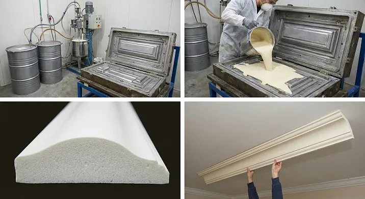 Из чего состоит полиуретановая лепнина? Основа — два жидких компонента. Полиол (многоатомный спирт — полиэфирная или полиэфирная основа, молекулярный вес несколько тысяч дальтон) и полиизоцианат (органическое соединение с реакционными NCO-группами — типично метилендифенилдиизоцианат, сокращенно МДИ). При смешивании происходит реакция полиприсоединения — изоцианатные группы реагируют с гидроксильными группами полиола, образуются уретановые связи, формируется полимерная сеть. Дополнительно в состав входят катализаторы (ускоряют реакцию — третичные амины, соединения олова), вспениватели (создают пористую структуру — вода, углекислота, пентан), стабилизаторы пены (силиконовые добавки, удерживают структуру ячеек), антипирены (снижают горючесть — фосфорорганические соединения, галогенсодержащие добавки), пигменты (если нужен окрашенный полиуретан). Все компоненты проходят контроль безопасности — после полной полимеризации полиуретан инертен, не выделяет летучих веществ, безопасен для жилых помещений.