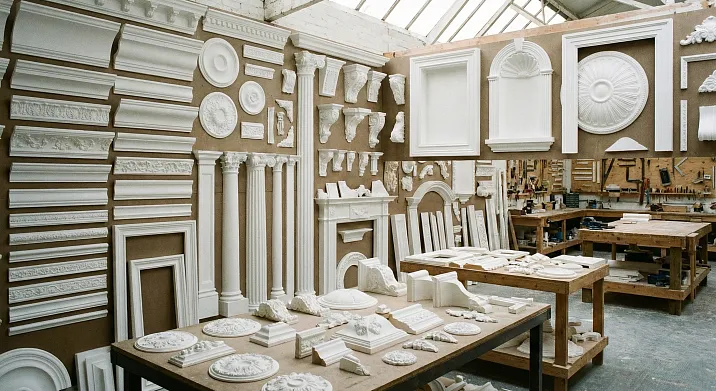 Эта статья — полная классификация декоративных элементов из полиуретана. Мы разложим по полочкам все типы: погонажные изделия (молдинги, карнизы, плинтусы, наличники — что идёт метрами, устанавливается по периметру, вдоль линий), штучные элементы (розетки, консоли, замковые камни, накладки — что продаётся поштучно, устанавливается в конкретных точках как акценты), архитектурные формы (колонны, пилястры, капители, базы — полные ордерные системы, создающие монументальность), панели и кессоны (большие декоративные плоскости для стен и потолков), специальные элементы (гибкие для арок, угловые для стыковки без подрезки), функциональные виды (с кабель-каналами, с подсветкой, с практической функцией помимо декоративной). Каждый тип разберём по параметрам: размеры, назначение, где применяется, сколько стоит, как монтируется. Цель — дать инструмент осознанного выбора, когда вы понимаете, какой элемент для какой задачи, как элементы сочетаются, как собрать из них композицию, превращающую интерьер в произведение.