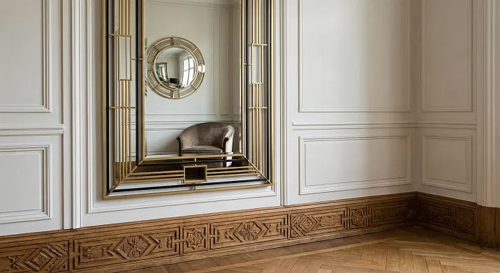 Превращение плоской окрашенной стены в архитектурную композицию из панелей, молдингов, зеркал — путь создания интерьера, который запоминается, производит впечатление, выдерживает проверку временем. Классическое буазери с зеркалом как филенкой создает элегантность, проверенную веками. Графичное арт-деко с черными плинтусами, рамами и геометрическими молдингами — дерзость и современность в историческом контексте.