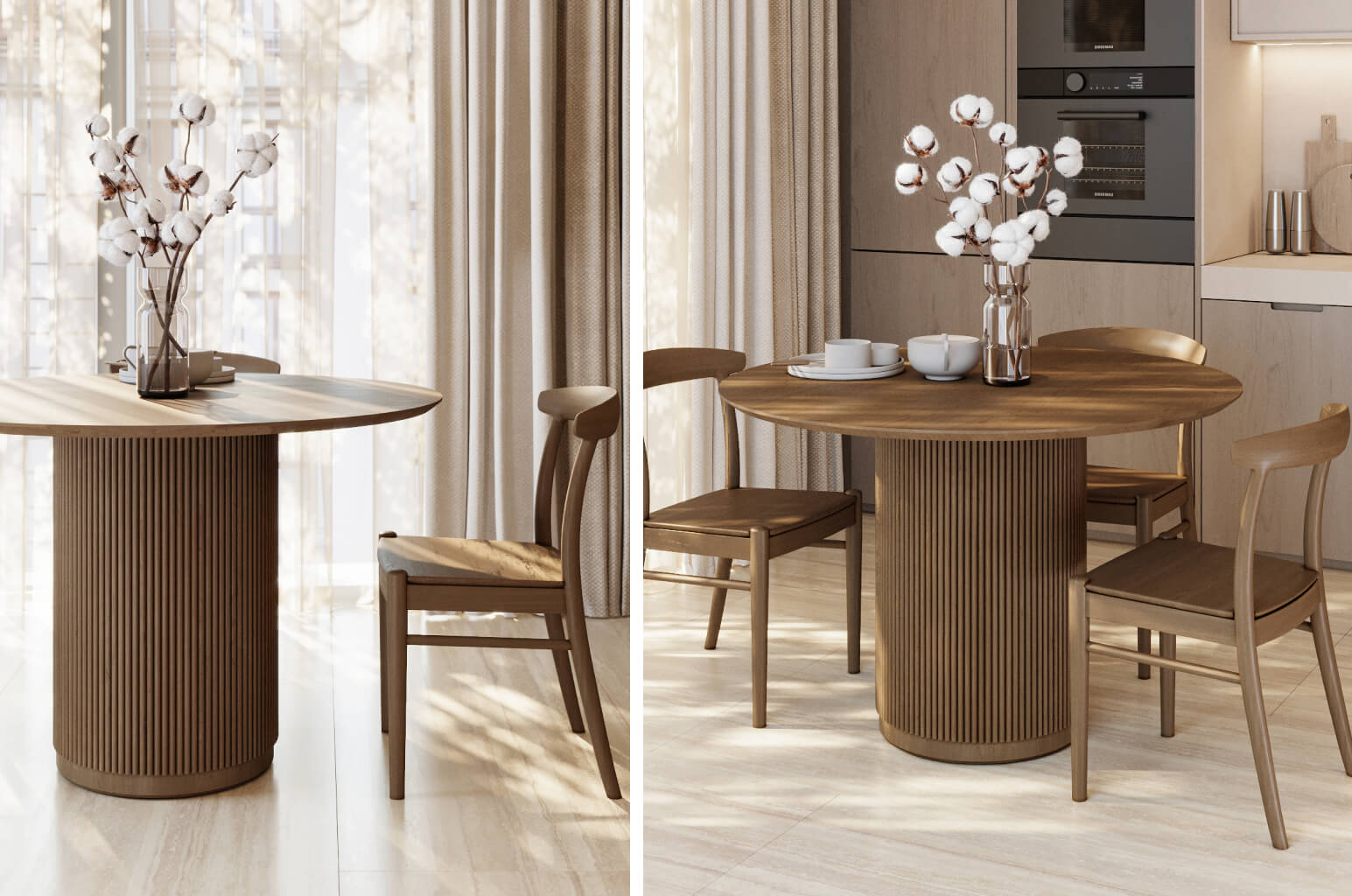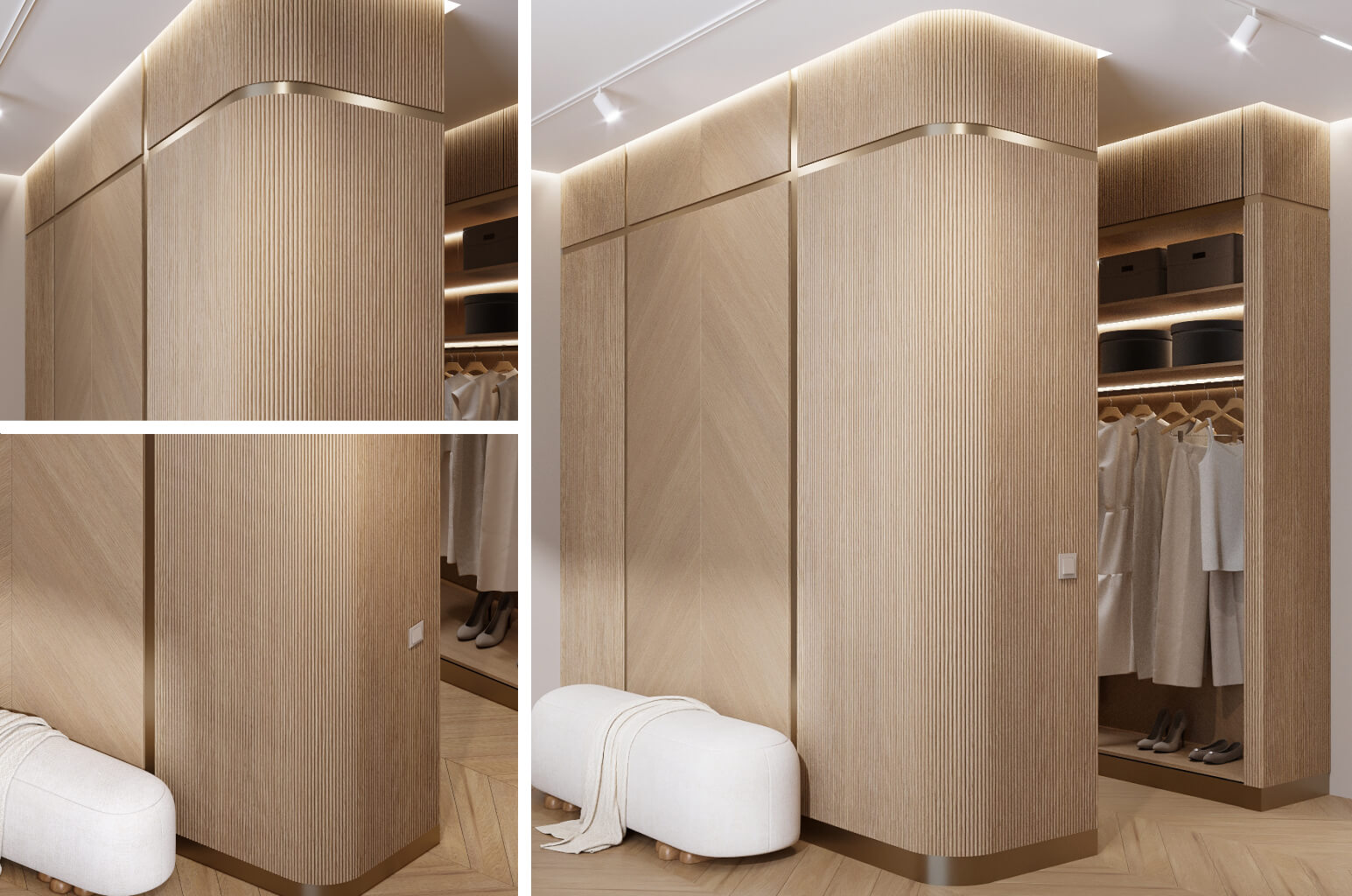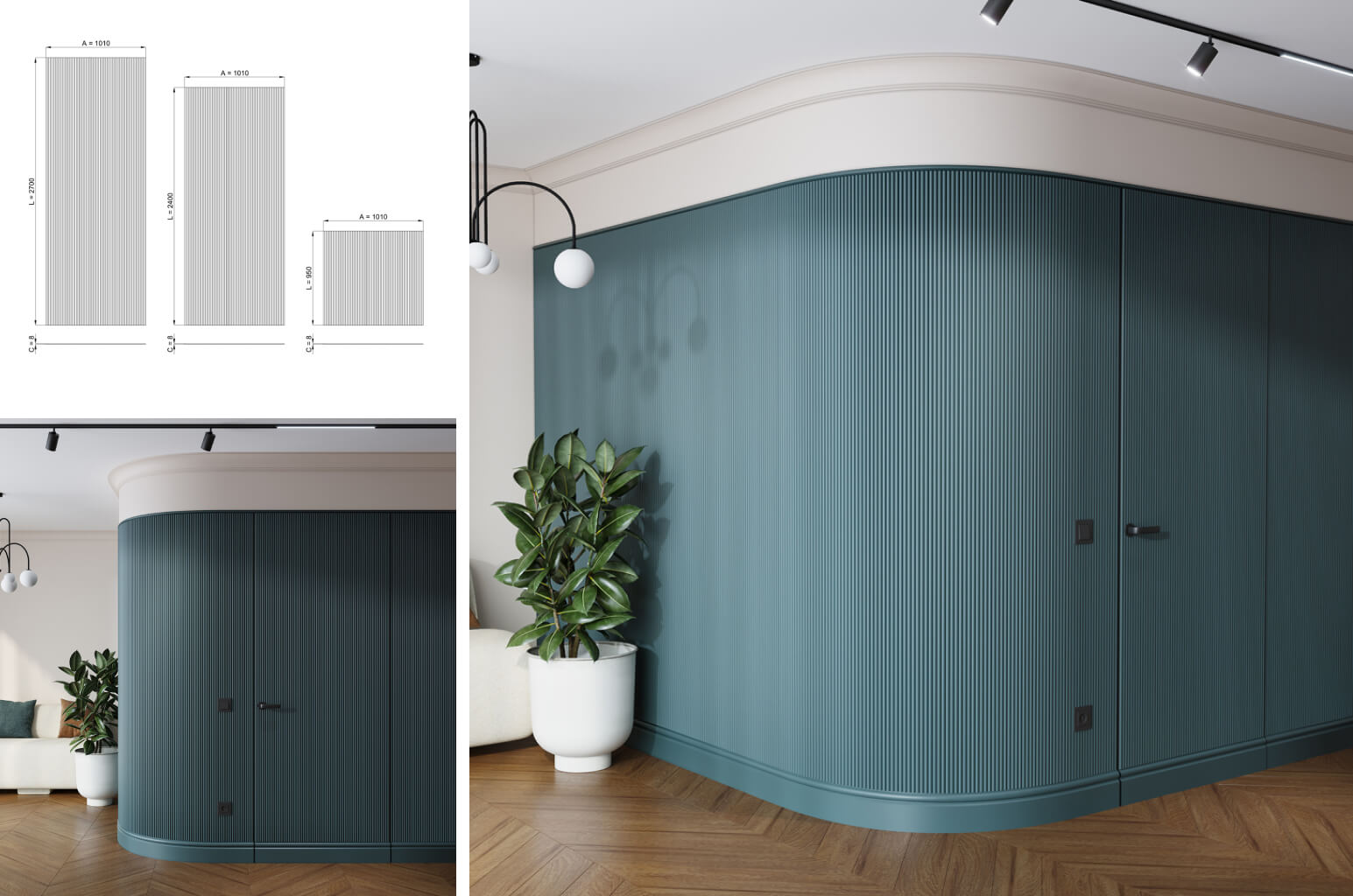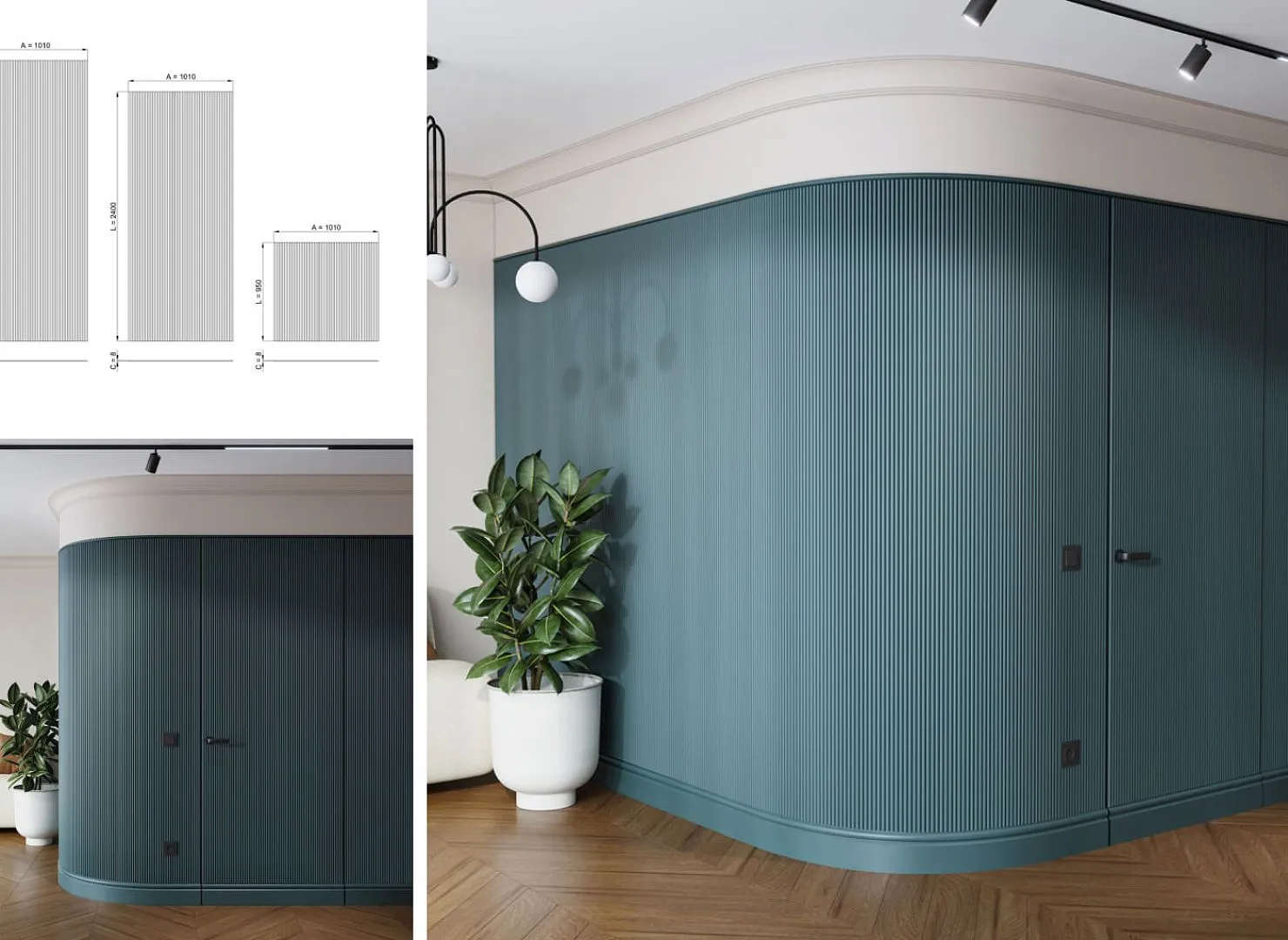 - Радиусные фасады: панель превращает гнутый фасад в фактурную поверхность без сложной фрезеровки.