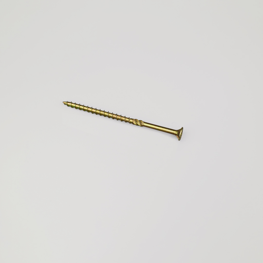 На стержне конструкционного самореза FUR-038 выполнены острые продольные фрезерующие насечки, которые выполняют функцию встроенного стружкоотвода. При вкручивании эти зазубрины моментально разрезают и выводят древесную стружку из монтажного канала, предотвращая заклинивание крепежа и снижая нагрузку на шуруповерт. Фрезерующие ребра особенно важны при работе с длинными саморезами, где накопление стружки в глубине отверстия могло бы создать критическое сопротивление.