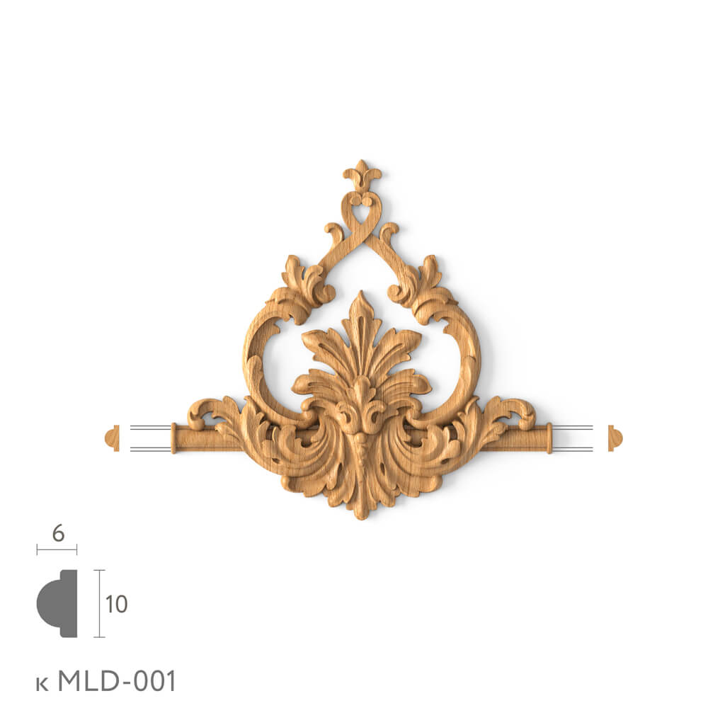 Купить декоративный элемент MLD-1-2.1 из дерева можно в каталоге STAVROS в разделе декор для молдингов — поштучно или партией, с выбором материала, с доставкой по России. Это системный компонент серии 001, спроектированный специально под профиль MLD-001: с тыльной выборкой, повторяющей его сечение, и орнаментом, стилистически согласованным со всеми остальными компонентами этой серии.