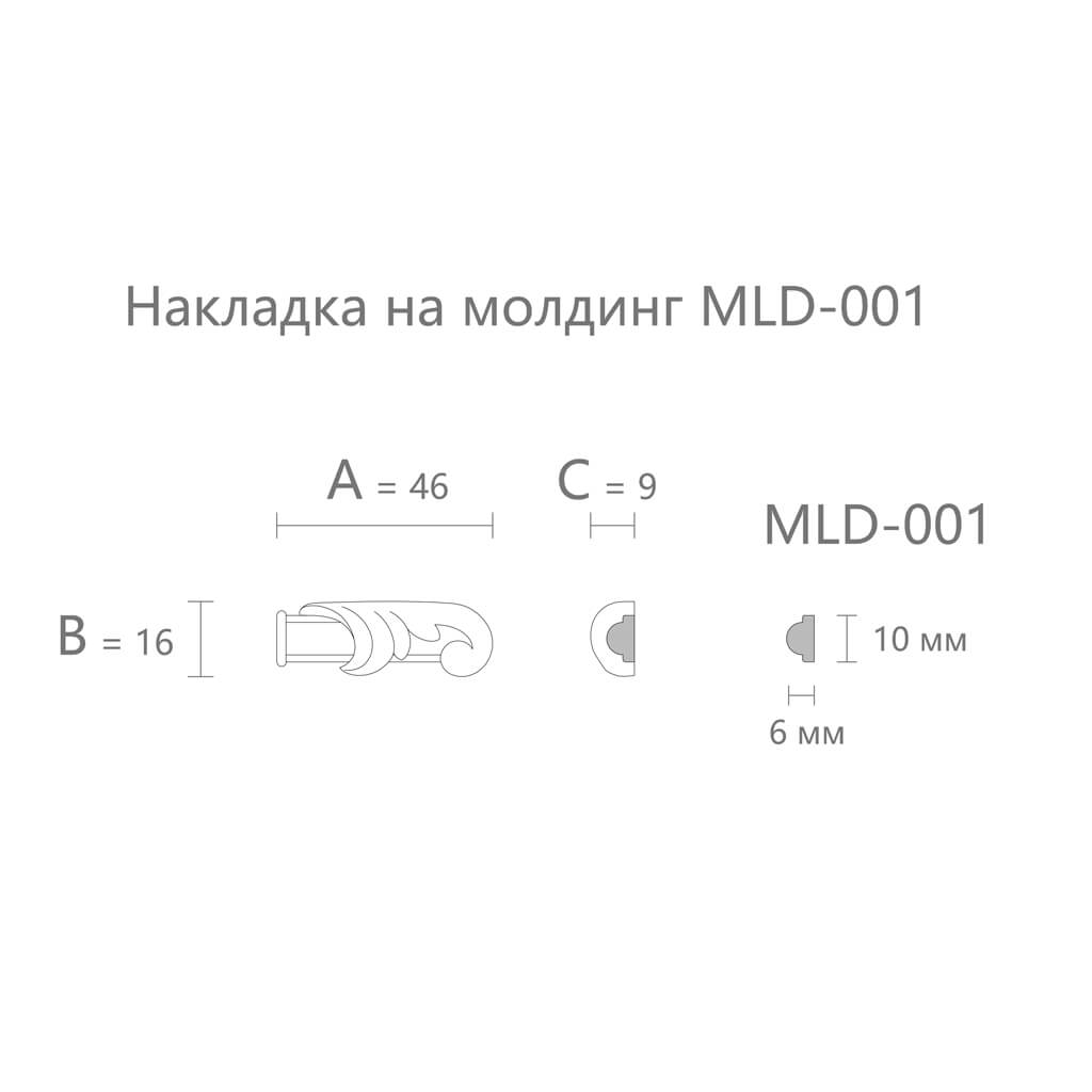 16 мм — ширина. Этот параметр соответствует ширине сечения молдинга MLD-001. При монтаже наконечник точно накрывает торцевую плоскость молдинга по ширине, не выходя за боковые грани. Это обеспечивает аккуратный, «заподлицо» переход по ширине и отсутствие нависающих краёв.