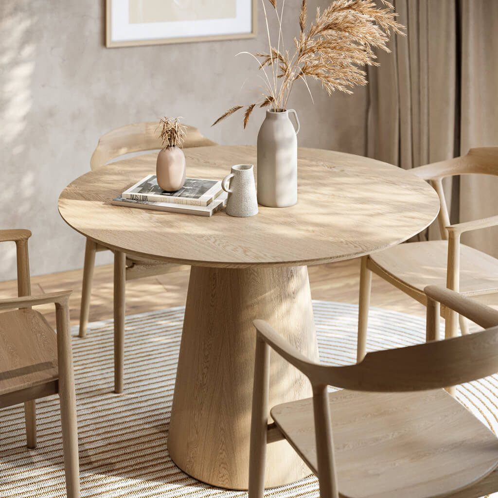 Коническая форма обеспечивает максимальное пространство для ног при сидении за столом, что особенно важно для обеденных зон и рабочих мест. Отсутствие горизонтальных связей между опорами исключает ограничения при размещении стульев вокруг стола.