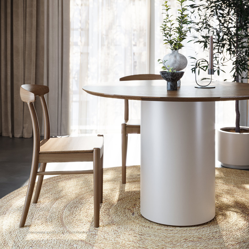 Цилиндрическая форма обеспечивает максимальную свободу размещения стульев вокруг стола, не создавая препятствий для ног сидящих. Отсутствие острых углов и выступающих элементов делает подстолье безопасным для использования в семьях с детьми и в общественных местах с интенсивным движением людей.