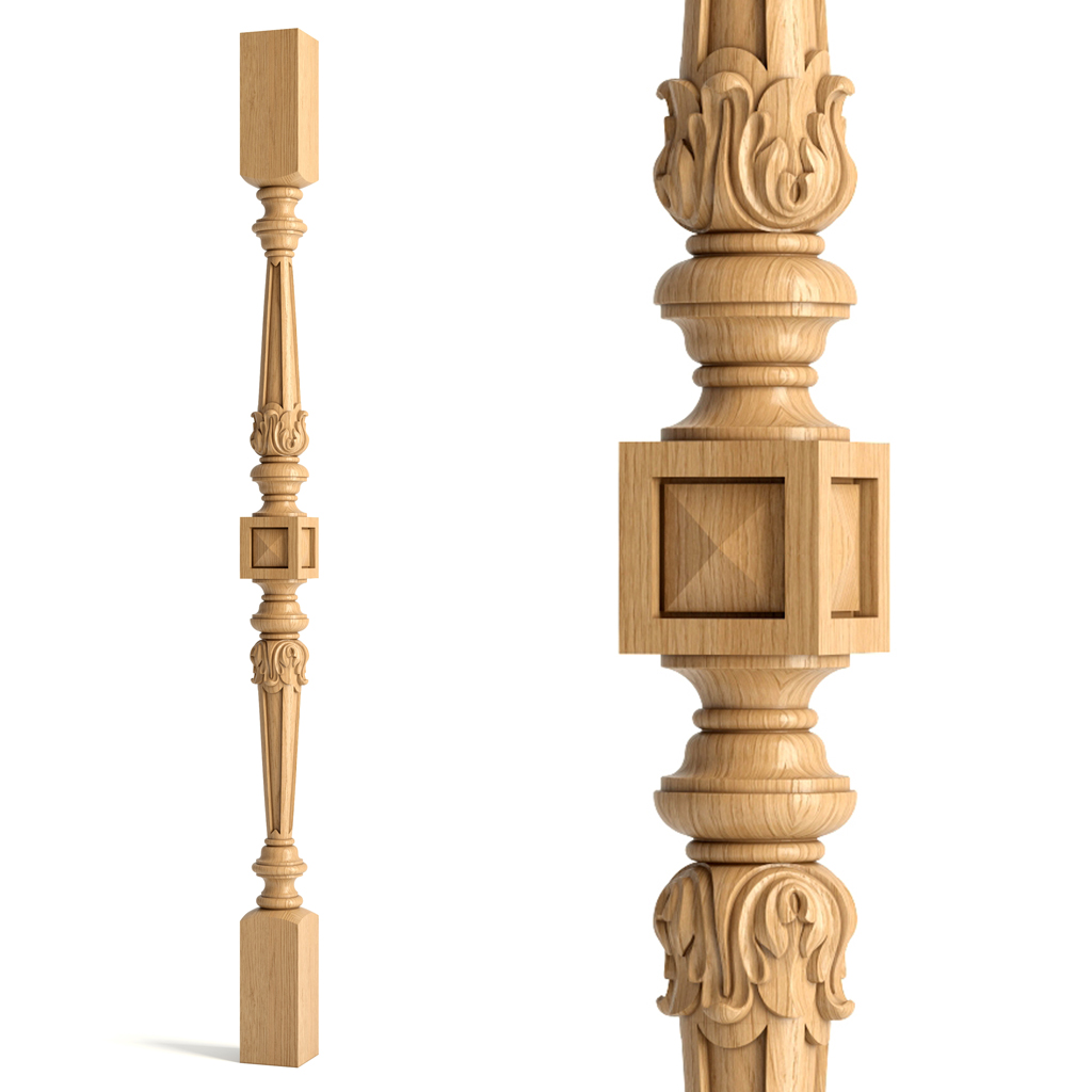 Модель L-025 – это изящная деревянная балясина с симметричным дизайном. Балясина украшена кубом в центральной части, а также каннелюрами и резными акантовыми листьями. Такие балясины составят идеальную композицию с резными столбами L-072.