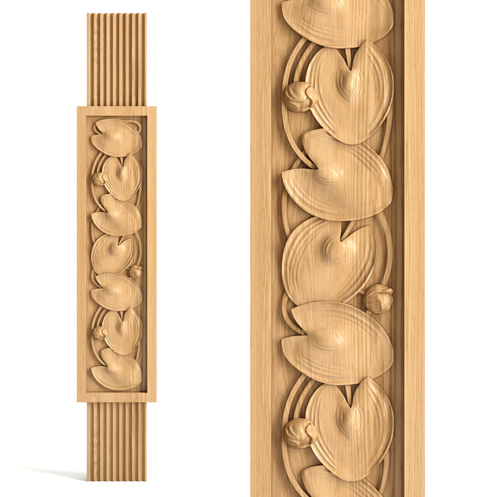 Деревянная балясина L-092.1 смотрится особенно интересно, благодаря резному декору в виде стилизованных листьев кувшинок. Каждый листок в этой модели искусно проработан. В верхней и нижней части балясина украшена вертикальными каннелюрами. Модель L-092.1 будет прекрасно сочетаться с нашим резным погонажем K-059.