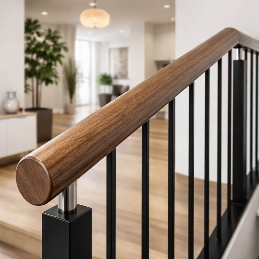 Современные лестничные конструкции часто используют комбинацию различных материалов для достижения оптимального сочетания эстетики, функциональности и экономической эффективности. Круглые деревянные поручни прекрасно сочетаются с металлическими стойками и балясинами из нержавеющей стали или окрашенного металла. Контраст между теплой текстурой дерева и холодным блеском металла создает выразительный визуальный эффект, особенно популярный в современных интерьерах.