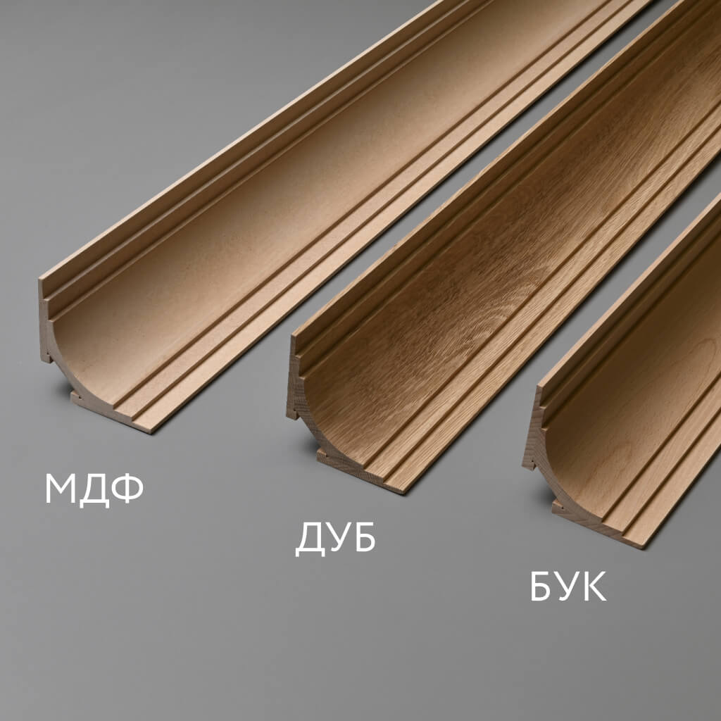 Буковый вариант карниза характеризуется однородной мелкопористой структурой и деликатным розовато-кремовым оттенком. Плотность букового массива 640-690 кг/м³ сочетает достаточную прочность с превосходной технологичностью обработки. Исключительная пластичность бука после пропаривания при температуре 105°C позволяет создавать элементы со сложными радиусными переходами.