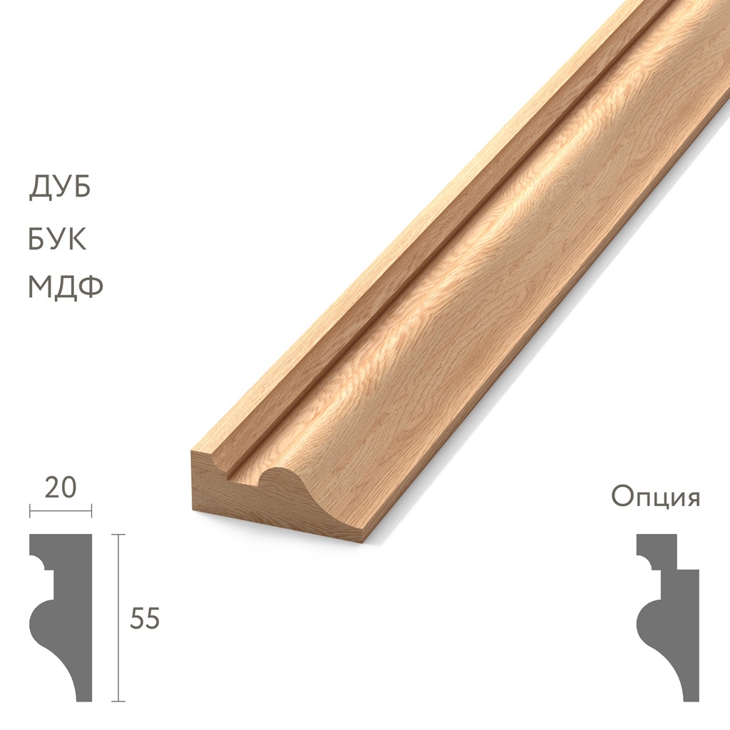 Декоративный молдинг 55×20 представляет практичное архитектурное решение с оптимальными пропорциями, созданное для интерьеров и мебельного производства, где требуется выразительная детализация и эффектное визуальное воздействие элементов. Изготовленный из европейского бука высокого качества и технологичного МДФ, этот деревянный молдинг 55×20 сочетает функциональность с классической эстетикой четвертькруглого профильного сечения.