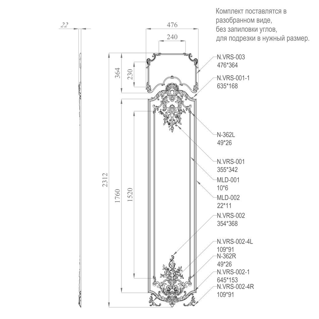 Комплект декора C.VRS-056 – это утончённое и функциональное решение для украшения мебели, стен и дверей. Этот набор декоративных элементов создан для тех, кто стремится к созданию стильного и гармоничного интерьера с нотками аристократичности. Универсальный дизайн и превосходное качество исполнения делают комплект C.VRS-056 незаменимым выбором для декорирования мебели в классическом и современном стилях.