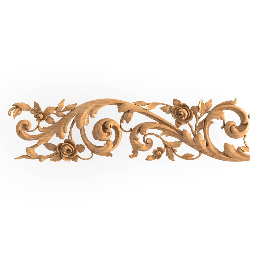 Декоративный багет из дерева K-130 — это именно орнаментальная панель. Высота 120 мм позволяет разместить на ней полноценный растительный мотив с завитками, листьями, цветочными элементами. Ширина рисунка и его пластика соответствуют классическому декоративному языку: не перегружены деталями, не упрощены до схематичности — живой, выразительный, профессиональный орнамент.
