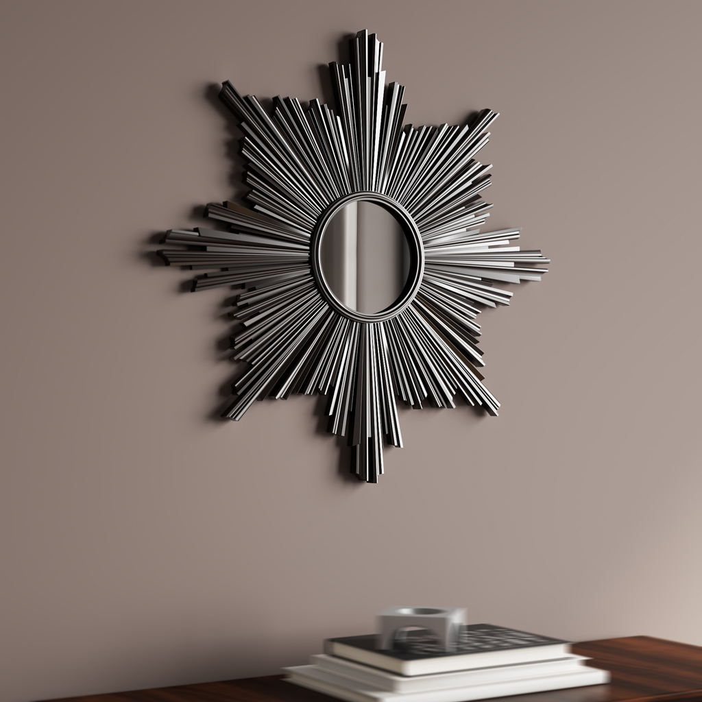 Круглая по форме резная рама для зеркала из стилизованных рельефных лучей солнца. Данная модель подходит для украшения интерьеров в классических и современных стилях.