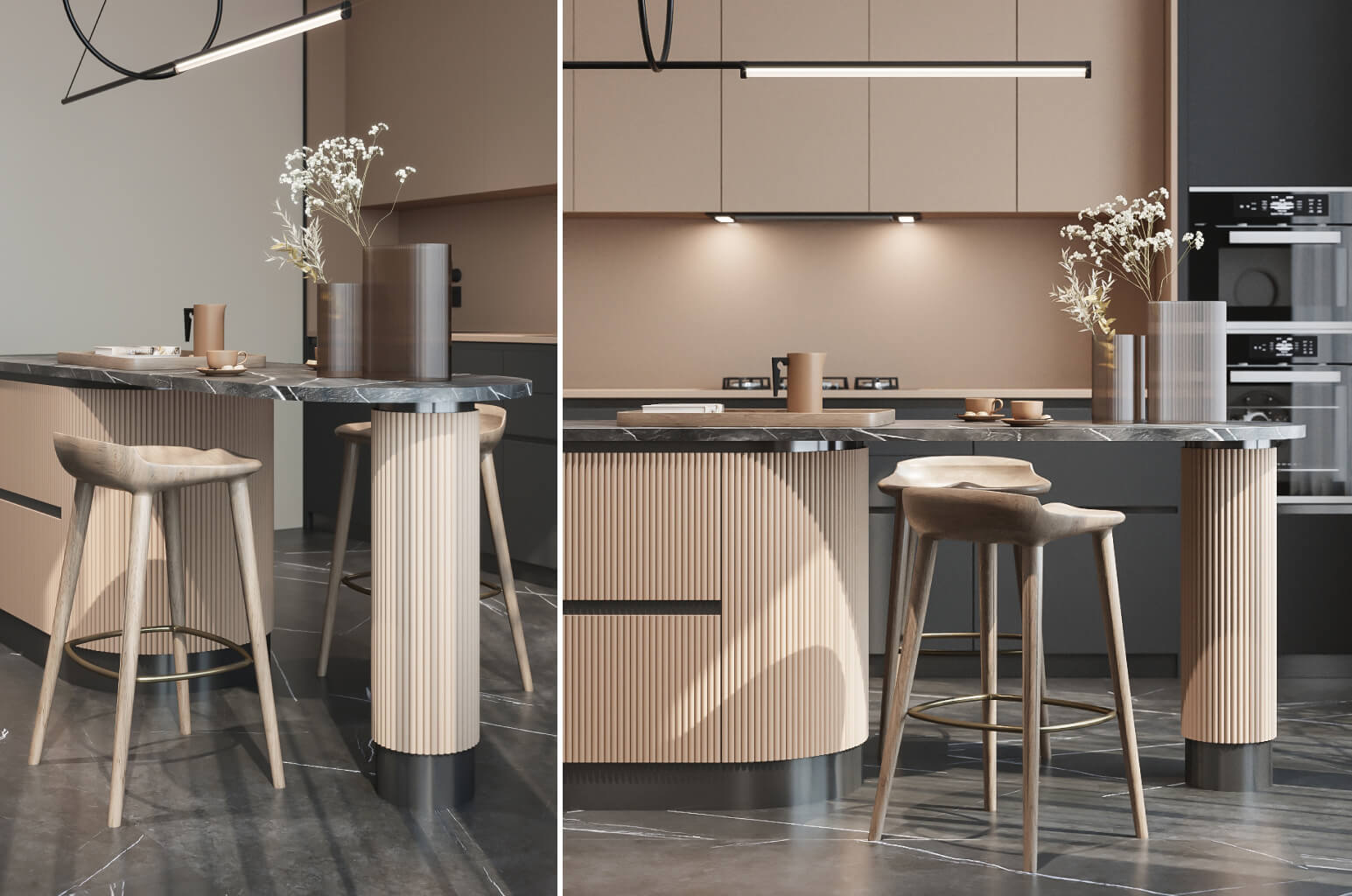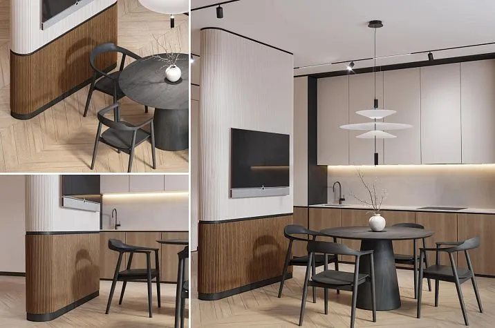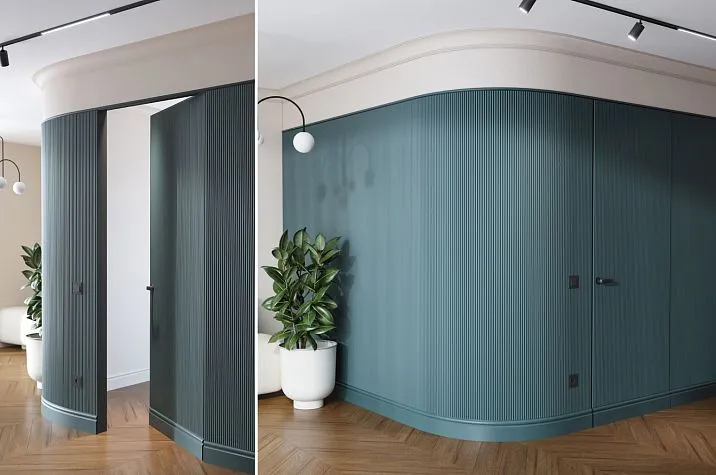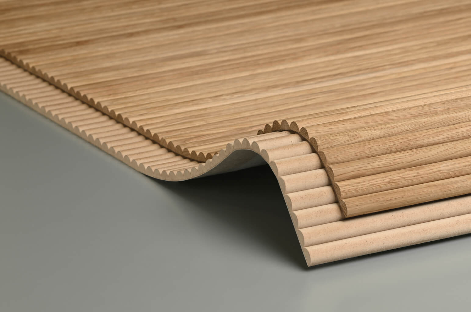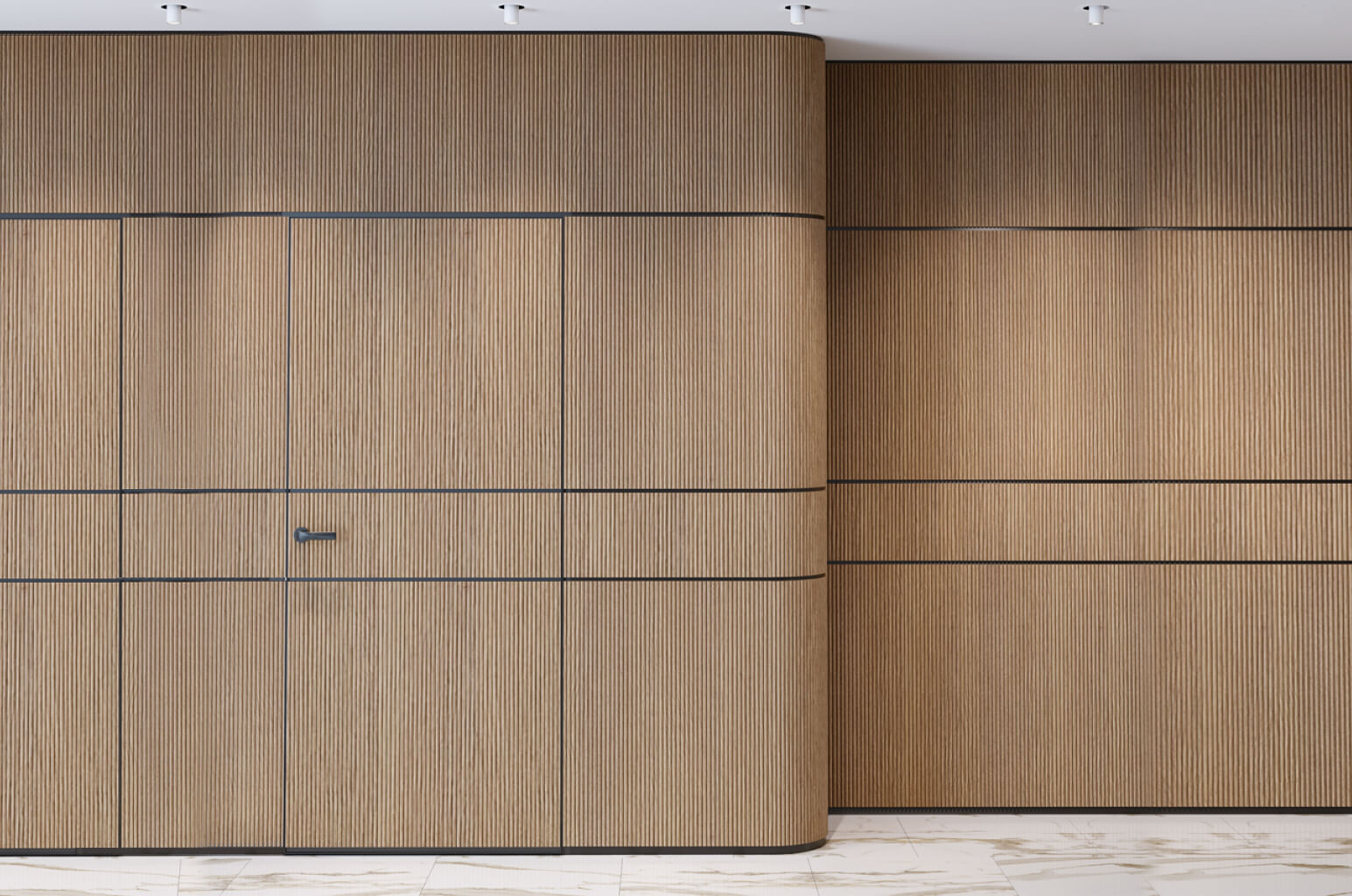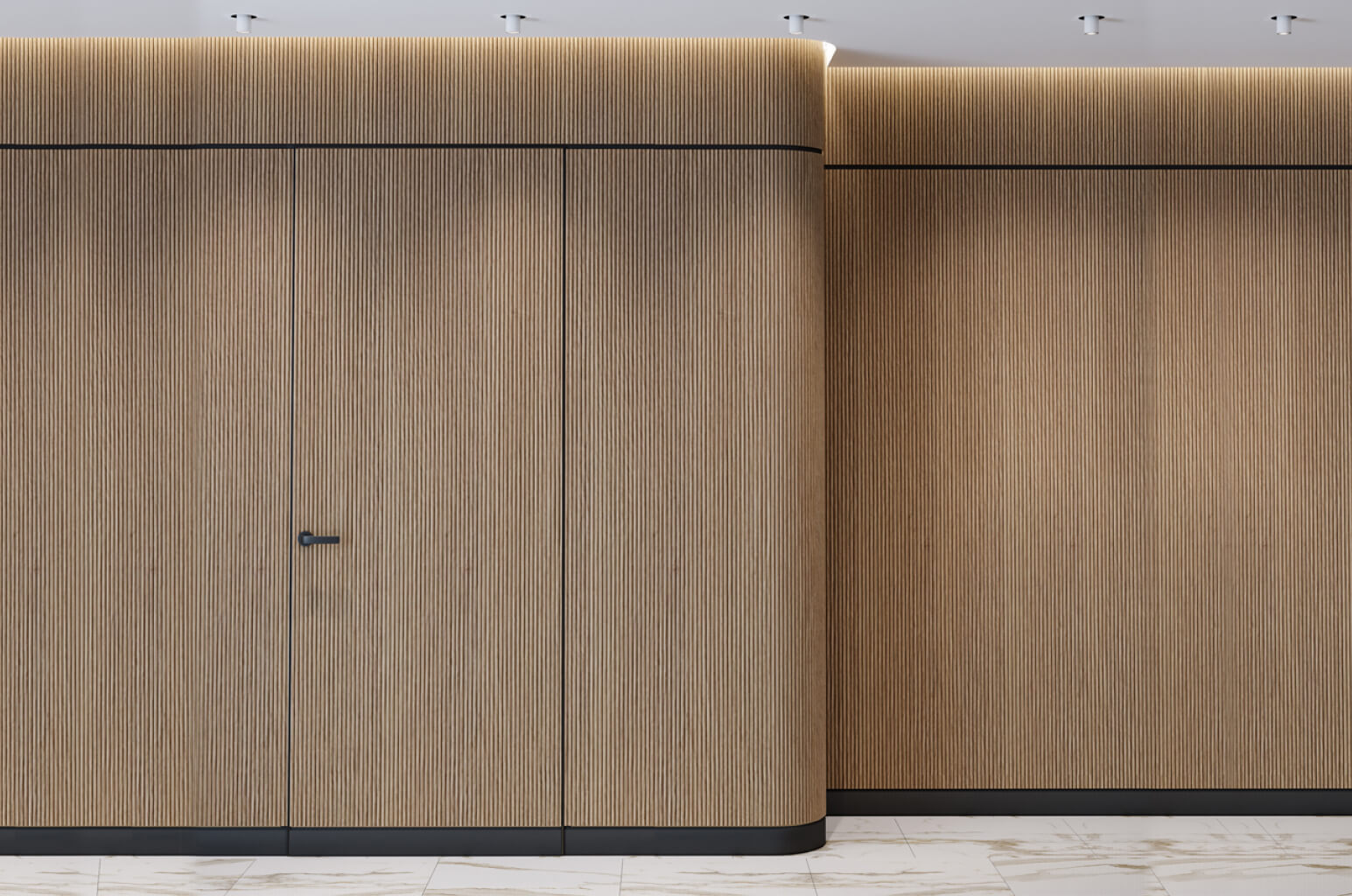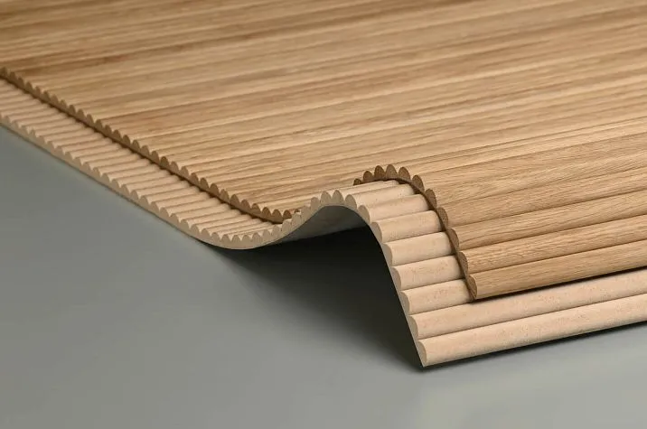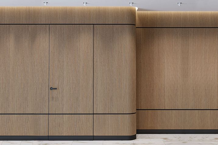 Гибкие реечные панели на тканевой основе — инновационное решение для радиусных поверхностей: колонн, арок, скруглённых углов, изогнутых мебельных фасадов. Панели повторяют любой изгиб без деформации реек и стыкуются бесшовно