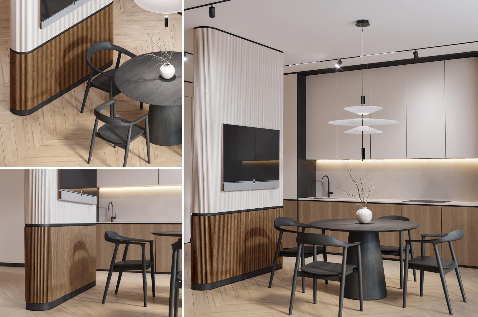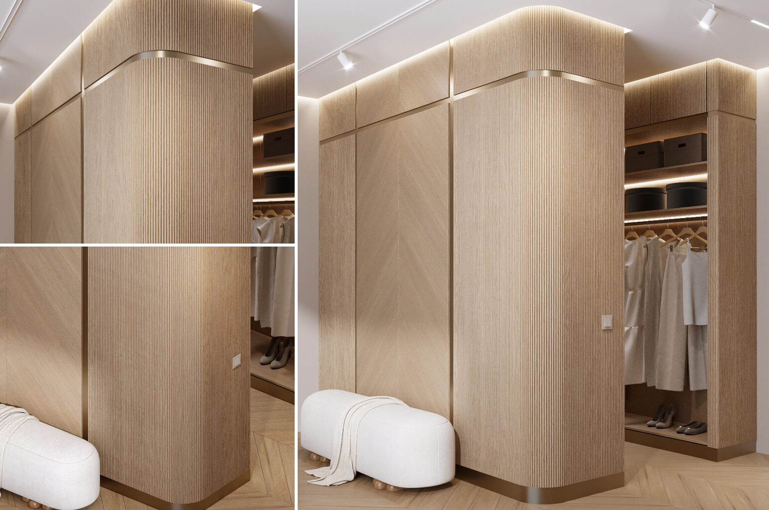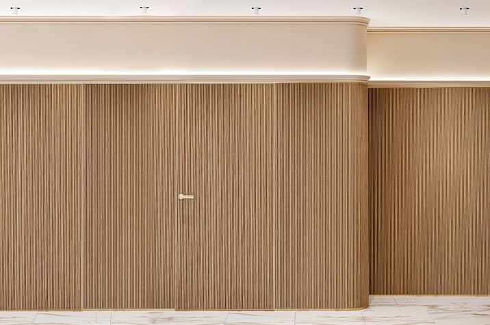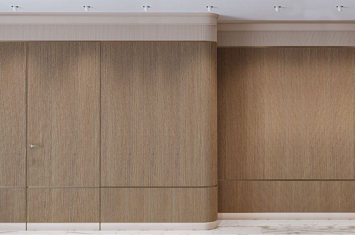 Панели из полукруглых штапиков — рейки с закруглённым профилем создают особенно мягкую и живую игру светотени, визуально обогащая поверхность при любом типе освещения