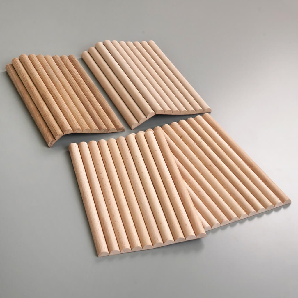 Шаг реек. Расстояние между рейками определяет визуальную плотность паттерна. На образце вы видите этот ритм в натуральную величину — не в пикселях на экране, а в миллиметрах в руках.