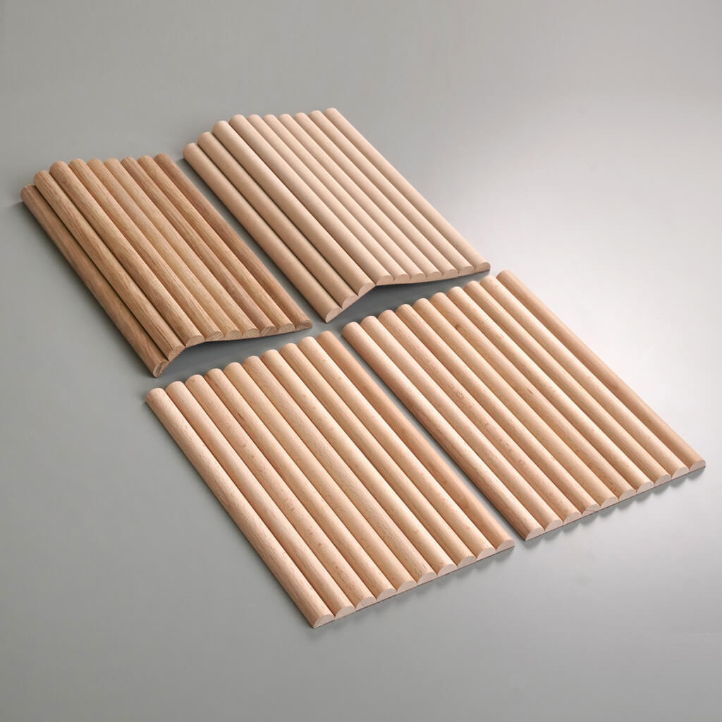 Спальни и изголовья. Реечная стена за изголовьем кровати — это один из трендовых сценариев, где важна мягкость и теплота материала. Образец из бука или дуба позволяет проверить, как натуральная текстура работает в жилом пространстве.