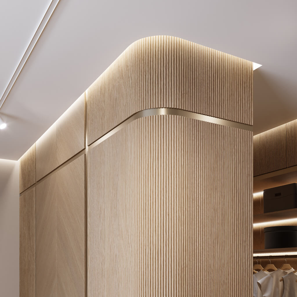 Гибкие реечные панели особенно востребованы при оформлении радиусных элементов мебели и архитектуры — ровно там, где любой другой отделочный материал требует дорогостоящей подгонки или оказывается просто неприменим.