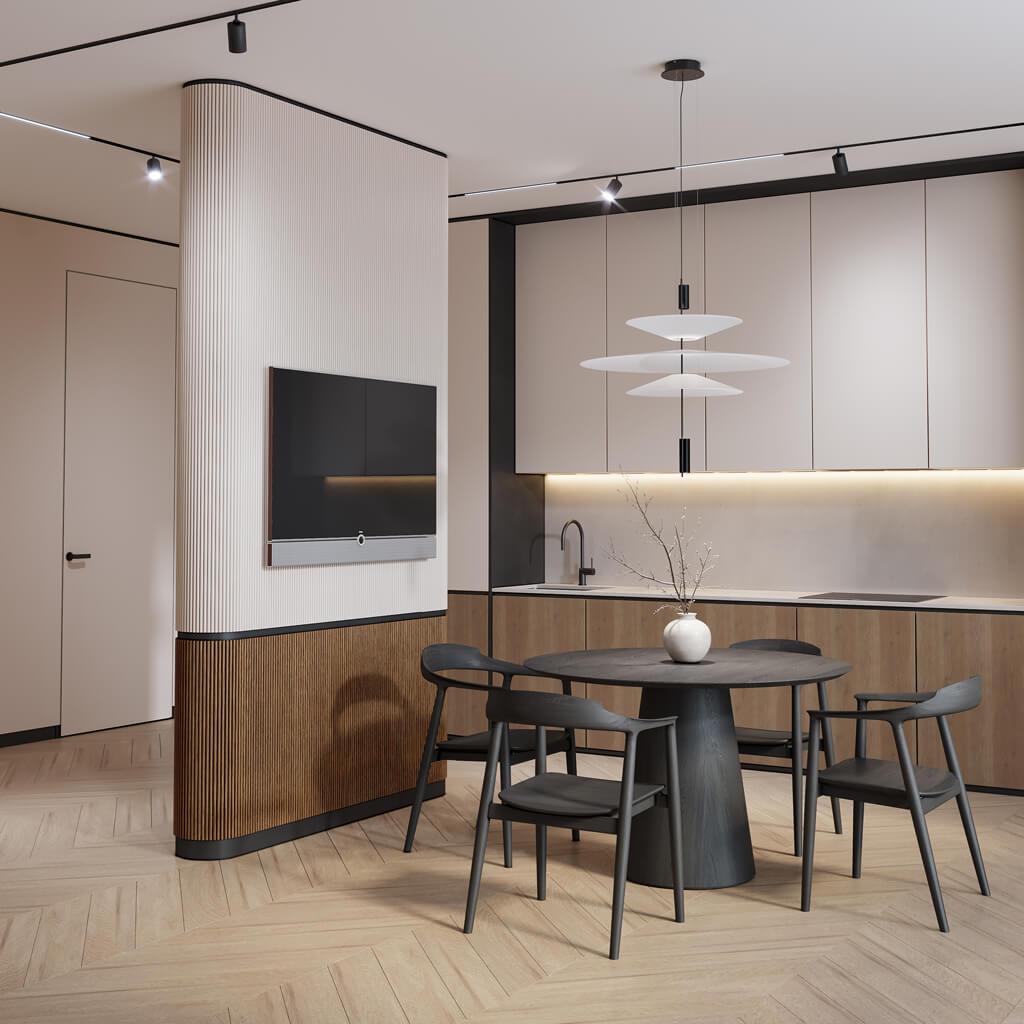 Камень и керамика — природная текстура камня или графика крупноформатного керамогранита создают контраст с линейным ритмом реек. Сочетание особенно эффектно на кухне: каменная столешница и реечный фасад острова