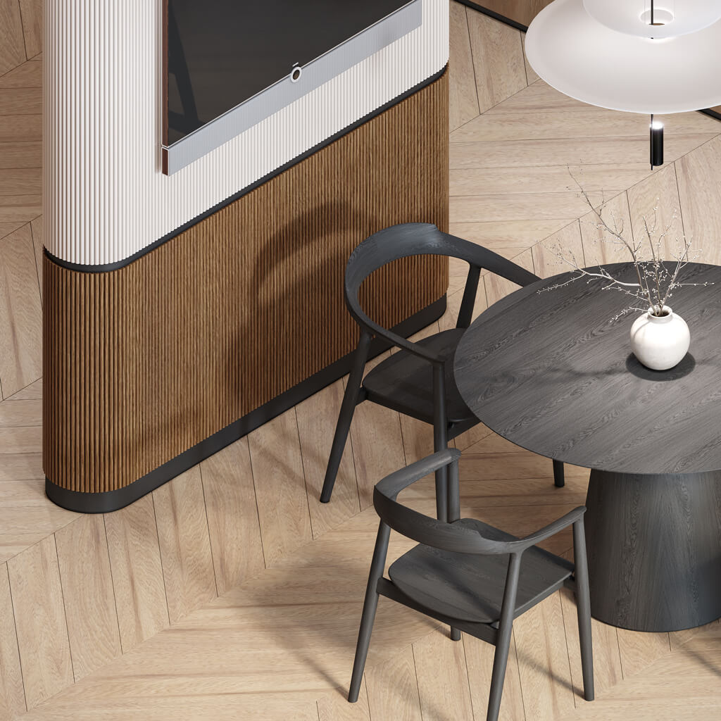 Полукруглый профиль штапика выбран не случайно. В отличие от прямоугольного сечения, скруглённая форма создаёт плавный светотеневой переход: свет не даёт резкой тени, а мягко скользит по поверхности. Результат — живая, дышащая текстура, которая меняет характер в зависимости от угла и интенсивности освещения. При направленном точечном свете поверхность приобретает скульптурную глубину; при рассеянном — становится сдержанной и благородной.